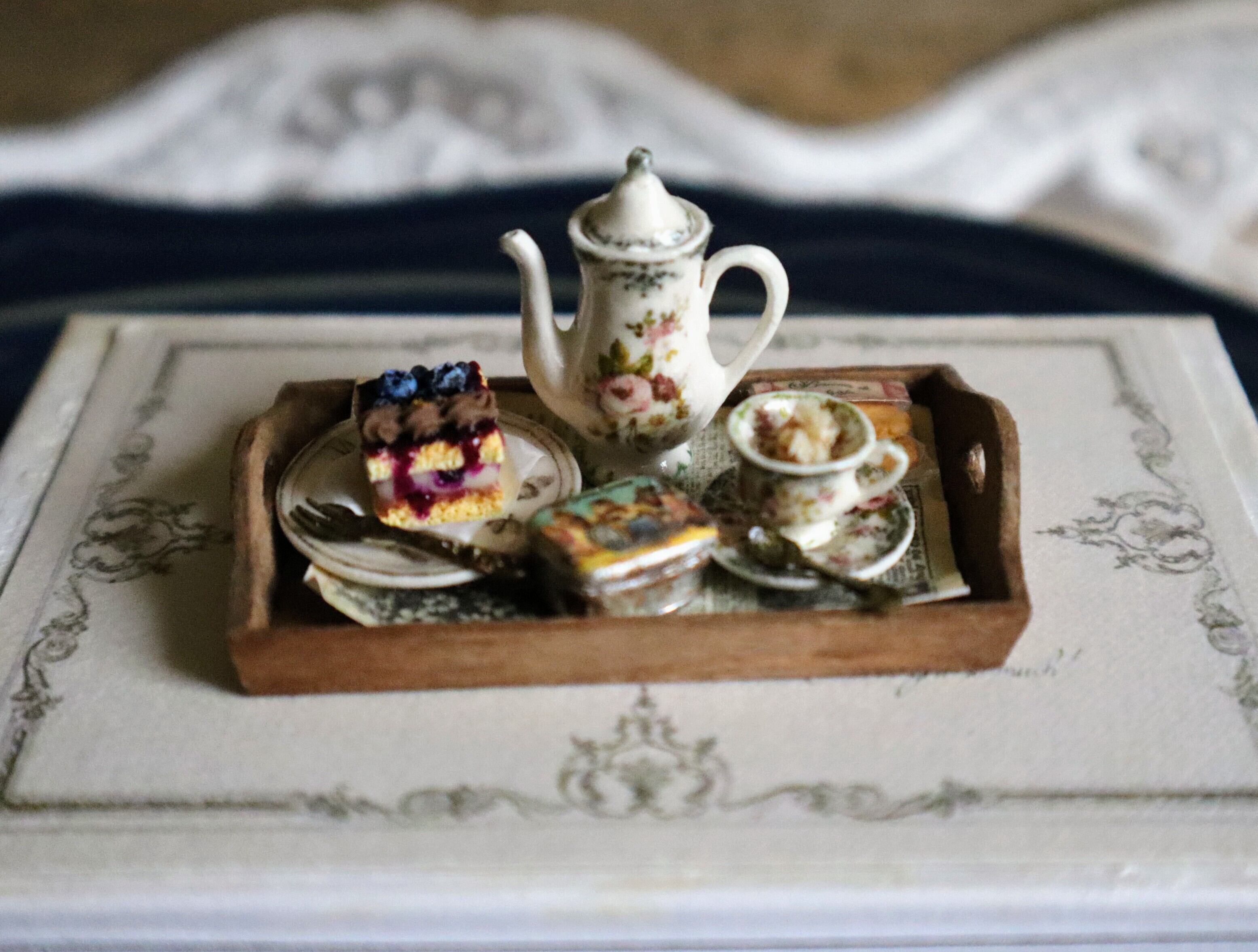 ミニチュアのアンティーク調食器とブルーベリーのケーキなどを木製トレイにのせたセットです。