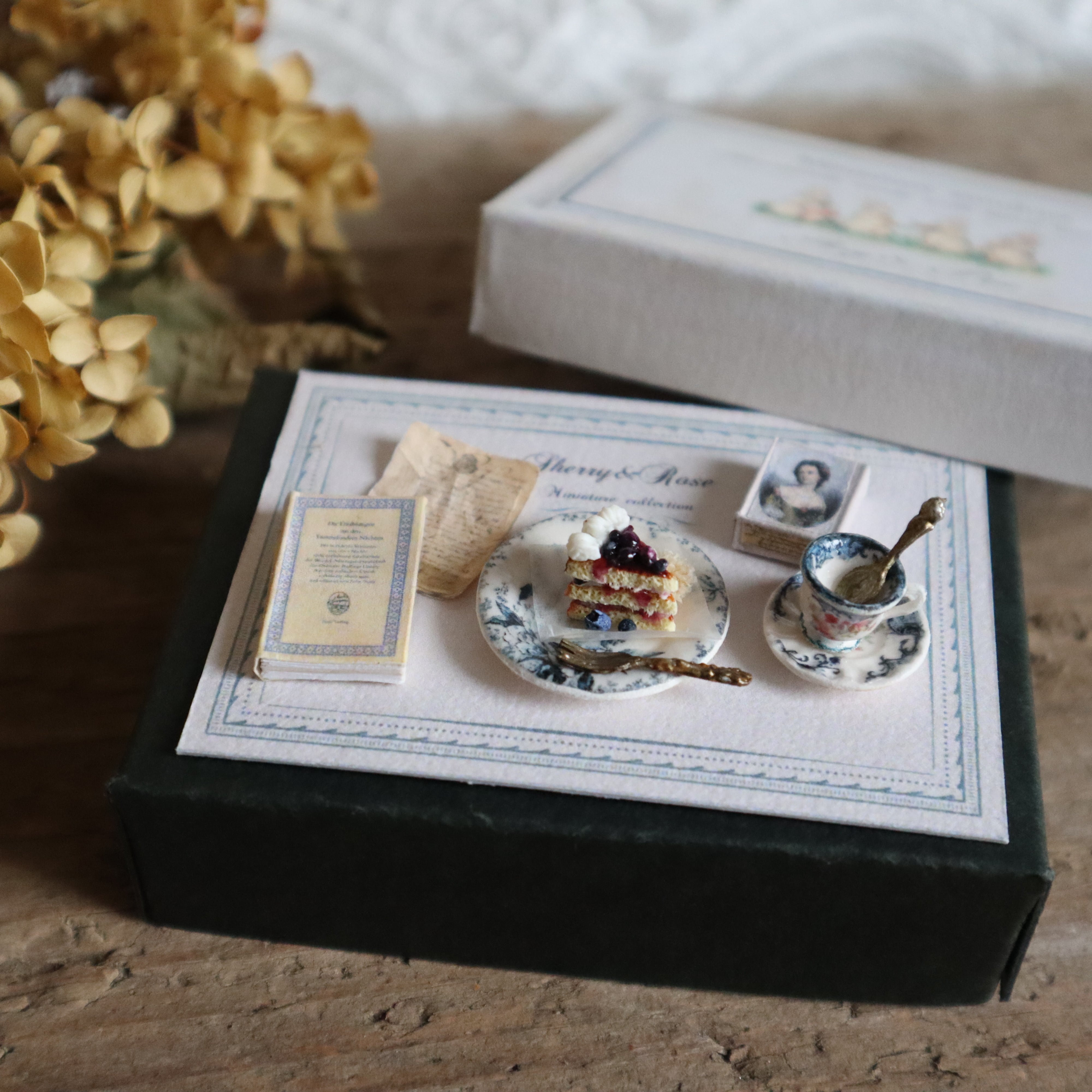 ミニチュアのアンティーク調食器とブルーベリーのケーキに本や紙箱をつけたセットです。