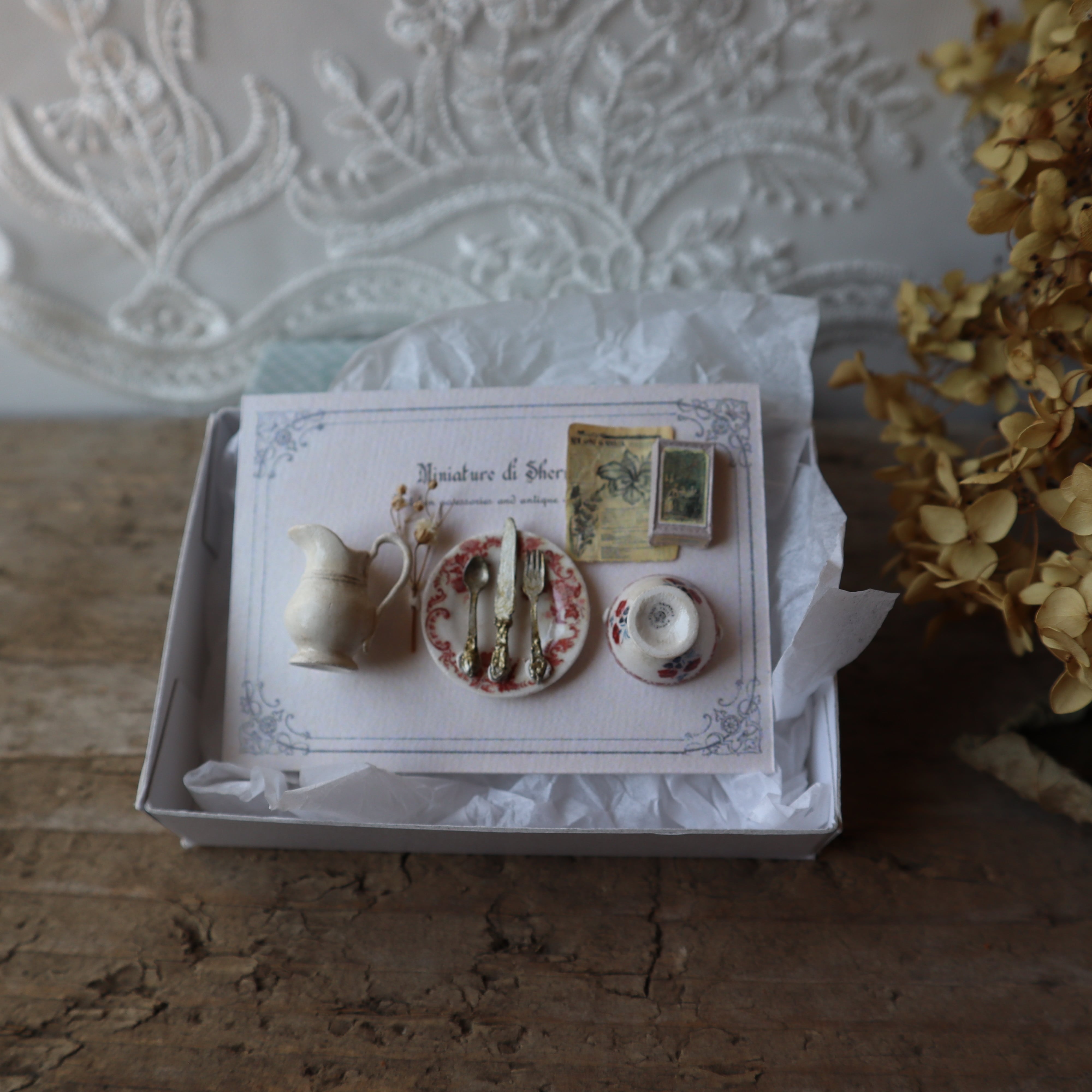 ミニチュアのアンティーク調食器とカトラリーに紙箱をつけたセットです。